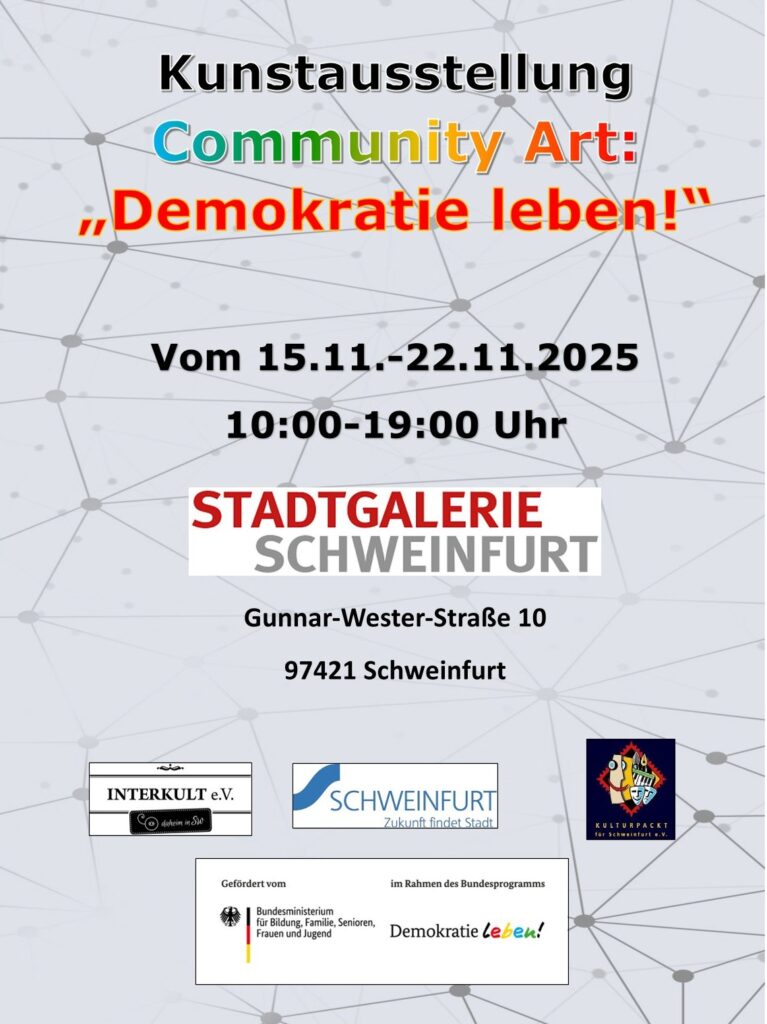 Vor und nach dem Vortrag besteht die erstmalige Gelegenheit, die Kunstausstellung „Community Art: Demokratie leben!“ von KulturPackt für Schweinfurt e.V.